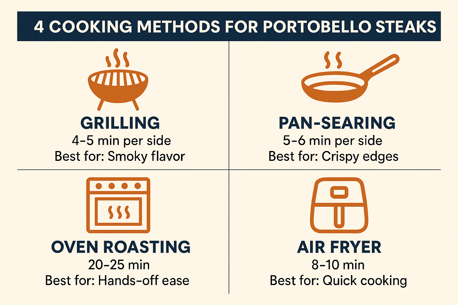 One of the best things about portobello mushroom steaks is their versatility. Different cooking methods produce subtly different results, so you can choose based on your equipment, weather, and desired outcome.